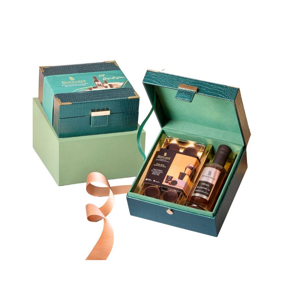 Scrigno con liquore al cioccolato e bicchierini – Bernardi Cioccolato